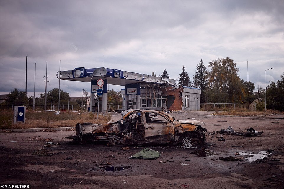 A destroyed car is seen in the town of Balakliia, liberated by the Ukrainian Armed Forces