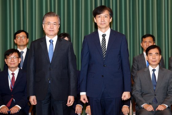 2019년 9월 9일 당시 문재인 대통령이 일가 비리 의혹이 터진 와중에 조국 법무부 장관에게 임명장을 수여했다. 이후 '조국 사태'가 커지며 한국 사회는 극심한 진영 갈등이 벌어졌다. [청와대사진기자단]