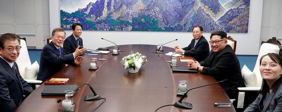 2017년 4월 27일 판문점 평화의집에서 당시 문재인 대통령과 김정은 북한 국무위원장이 남북정상회담에 앞서 환담하고 있다. 왼쪽부터 시계방향으로 서훈 국가정보원장, 문 대통령, 임종석 대통령 비서실장, 김영철 당중앙위원회 부위원장, 김 위원장, 김여정 당중앙위원회 제1부부장. [연합뉴스]