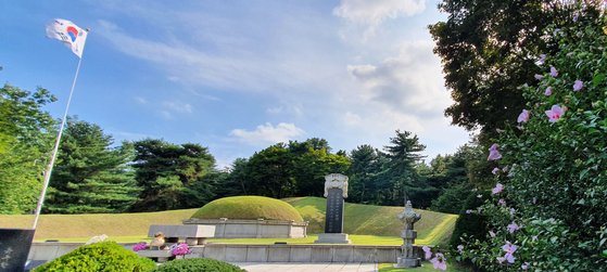 서울현충원에 조성된 건국 대통령 이승만 부부 묘역에 태극기가 휘날리고 무궁화가 피었다. 장세정 기자