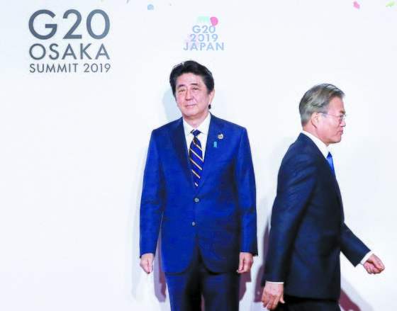문재인 전 대통령이 2019년 오사카에서 열린 G20 정상회의 공식환영식에서 의장국인 아베 신조 당시 읿본 총리와 악수한 뒤 이동하고 있다. 연합뉴스