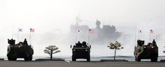 10일 해군사관학교에서 열린 제77기 졸업 및 임관식에서 한미동맹 70주년을 기념해 한미 해병대원이 함께 탑승한 상륙돌격장갑차와 차륜형장갑차가 상륙작전을 시연하고 있다. 대통령실통신사진기자단