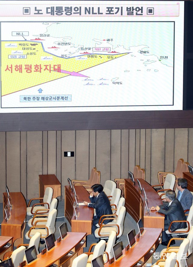 2013년 11월 20일 국회에서 열린 외교통일안보 대정부 질의에서 노무현 전 대통령의 ‘NLL 포기 발언’ 관련 자료가 화면에 나타나 있다. 사진 오른쪽 통로측 자리에 앉은 사람이 문재인 전 대통령(당시 새정치민주연합 19대 국회의원)이다. 동아일보DB