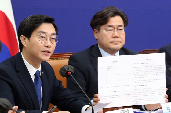 장경태(왼쪽) 더불어민주당 최고위원이 26일 오전 서울 여의도 국회에서 열린 최고위원회의에서 모두발언을 하고 있다. 뉴스1