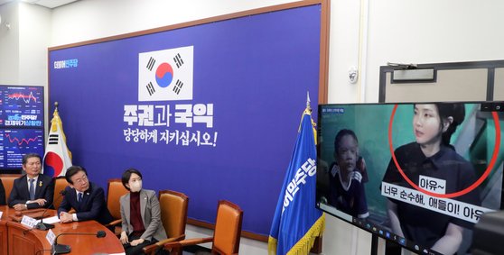 이재명 더불어민주당 대표가 26일 오전 서울 여의도 국회에서 열린 최고위원회의에서 '김건희 여사 캄보디아 조명 의혹' 영상을 살펴보고 있다. 뉴스1