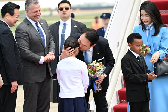 미국을 국빈 방문한 윤석열 대통령과 부인 김건희 여사가 지난 24일 오후(현지시간) 워싱턴DC 인근 앤드루스 공군기지에 도착해 화동들로부터 꽃다발을 받고 있다. 강정현 기자