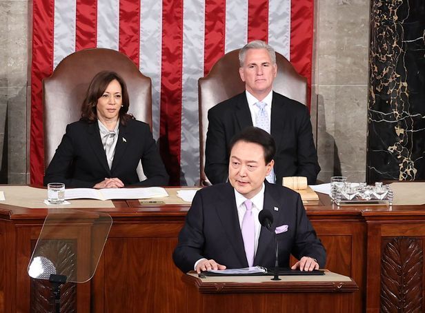 윤석열 대통령은 27일(현지 시각) 워싱턴DC 미 의회를 찾아 상하원 합동연설을 하며 “한미 동맹이 미래로 전진하는, 행동하는 동맹으로 거듭나야 한다”고 강조했다. 한국 대통령이 미 의회에서 연설을 한 건 2013년 박근혜 대통령 이후 10년 만이다. 이날 연설은 영어로 44분 정도 진행했다. 윤 대통령은 연설 중간에 자기가 미 의회에는 아이돌 그룹 BTS보다 먼저 왔다며 영어로 조크도 했다. 윤 대통령 연설에 의원석과 방청석에선 박수가 56번, 이 중 기립 박수는 23번 나왔다. 다음은 연설문 주요 내용.
