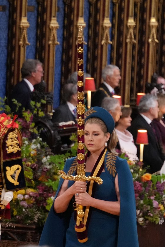 6일(현지시간) 영국 국와의 대관식에서 페니 모돈트 추밀원 의장이 왕을 상징하는 보검을 들고 있다. 로이터=연합뉴스