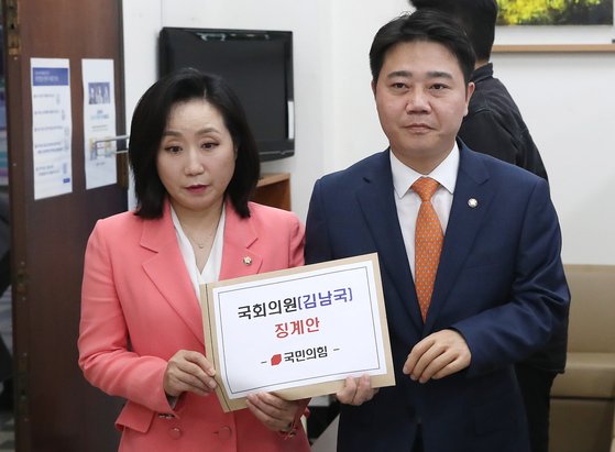 국민의힘 전주혜 원내대변인(왼쪽)과 지성호 원내부대표가 8일 서울 여의도 국회에서 ‘60억 코인’ 논란을 빚은 김남국 더불어민주당 의원에 대한 징계안을 의안과에 제출하고 있다. [뉴스1]