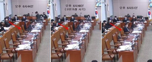 약 5분 뒤 김 의원이 또 다시 회의장에서 사라졌다. 김 의원이 코인 거래를 한 것으로 추정되는 6시48분에도 김 의원의 모습은 회의장에서 확인할 수 없었다. 사라진 김 의원은 그날 6시52분쯤 영상에 잡힌 마지막 전체 화면에서도 여전히 모습을 찾기 어려웠고, 4분 뒤 산회가 선포됐다.
