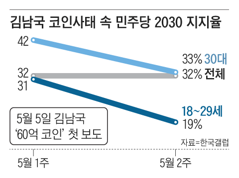 한국갤럽은 12일 김 의원 코인 사태 이후 민주당의 2030 청년 지지율이 10%포인트가량 떨어졌다는 여론조사 결과를 발표했다. 갤럽이 지난 9~11일 전국 만 18세 이상 1000명을 대상으로 조사한 결과, 지난주 31%였던 18∼29세 지지율은 19%로 12%포인트 하락했다. 30대 지지율도 42%에서 33%로 9%포인트 떨어졌다. 선거 승패를 가르는 ‘스윙 보터’인 2030세대 여론에 김 의원 코인 사태가 결정적 악재로 작용한 셈이다. 전체 지지율은 32%로 직전 조사와 동일했다.