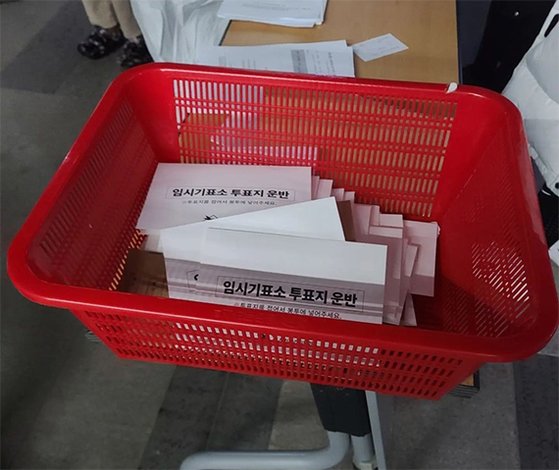 지난해 3월 대선 당시 코로나19 확진자와 격리자 투표용지를 플라스틱 소쿠리에 모아놓은 모습. 인스타그램