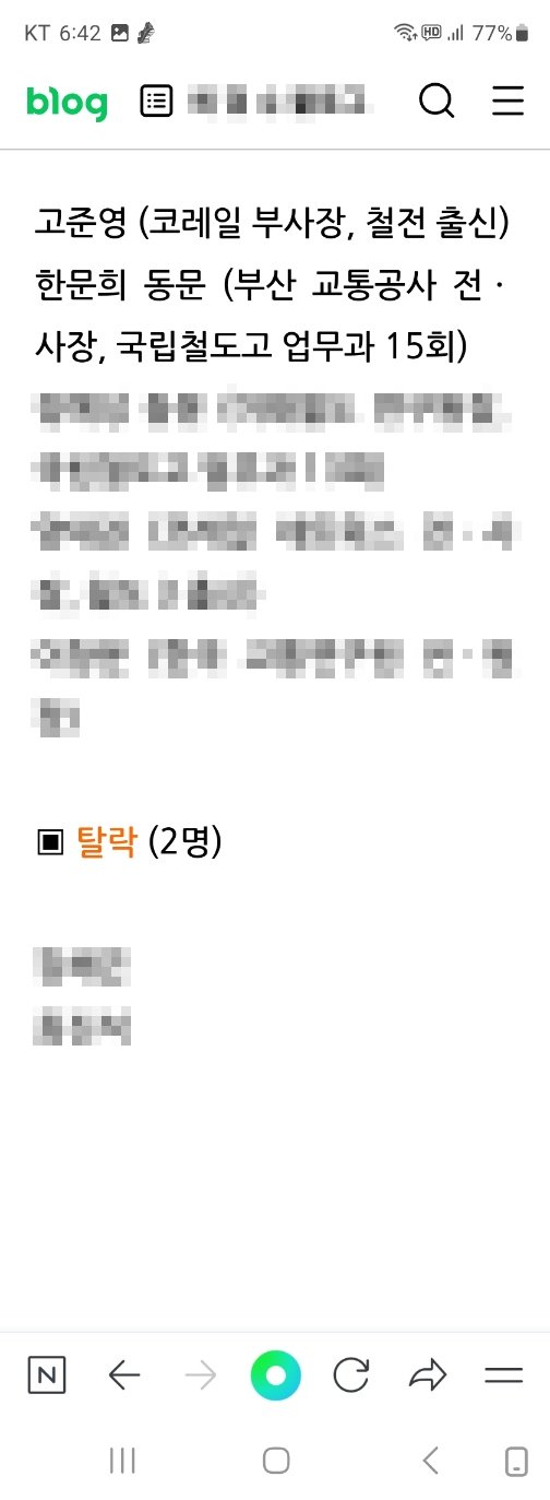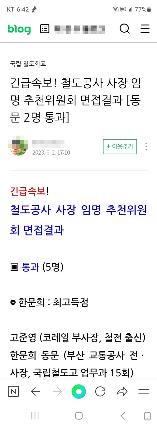 그런데 이번 코레일 임추위 결과가 고스란히 유명 포털의 한 블로그에 공개됐다. 이 블로그는 지금은 없어진 국립철도고등학교(철고) 동문이 운영 중인 것으로 확인됐다.