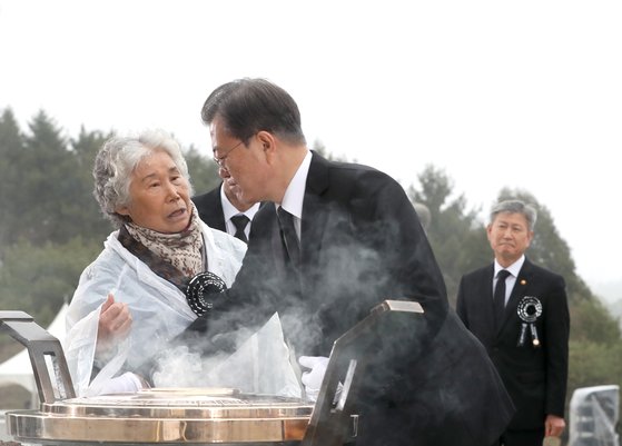 문재인 대통령이 2020년 3월 27일 국립대전현충원에서 열린 서해수호의 날 기념식에서 분향하던 중 고 민평기 상사의 모친 윤청자 여사의 질문을 받고 있다. 윤 여사는 문 대통령에게 "이게(천안함 폭침) 북한의 소행인지, 누구의 소행인지 말씀 좀 해달라"고 했다. 연합뉴스