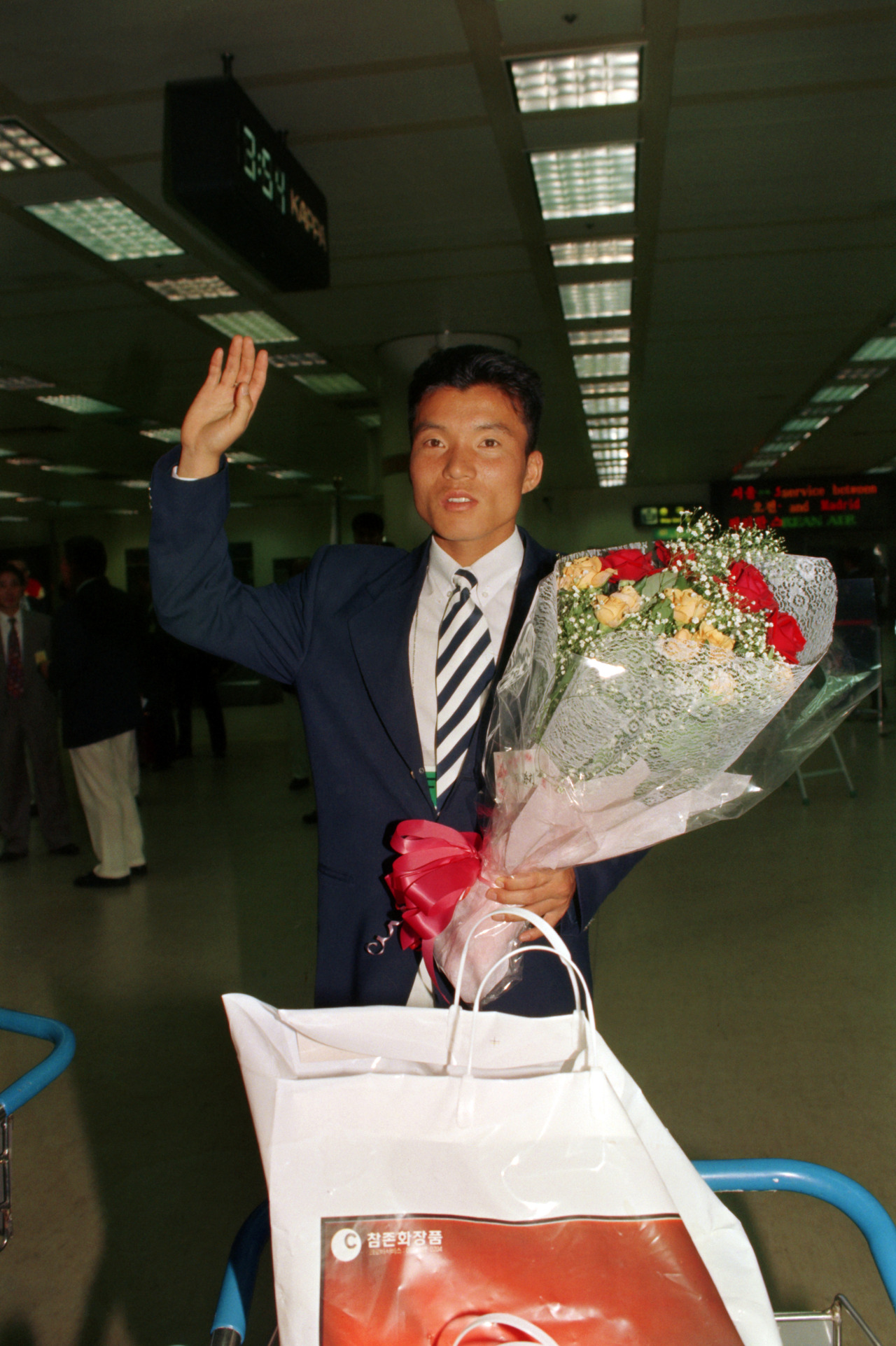 1994년 10월 17일, 히로시마 아시안게임 마라톤을 제패하고 대회 최우수선수(MVP)로 뽑힌 황영조 선수가 선수단과 함께 김포공항에 도착