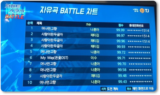 2006년 2월 20일에 노래반주기 생산업체 TJ미디어가 자사 반주기를 통해 집계한 자료에 따르면 나훈아는 '노래방 수록곡 순위'에서 1위에 올랐다.