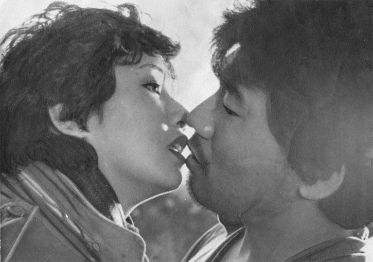▎영화 [마음은 외로운 사냥꾼]의 한 장면. 주연배우 나훈아(오른쪽)와 정윤희가 키스 신을 연출하고 있다.