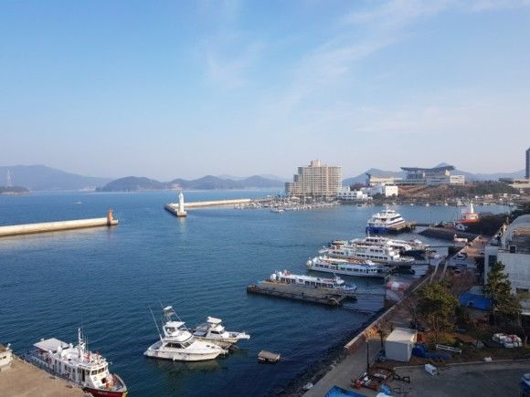남망산에서 내려다본 통영 바다. (멀리 바라 보이는 건물이 통영 마리나리조트).