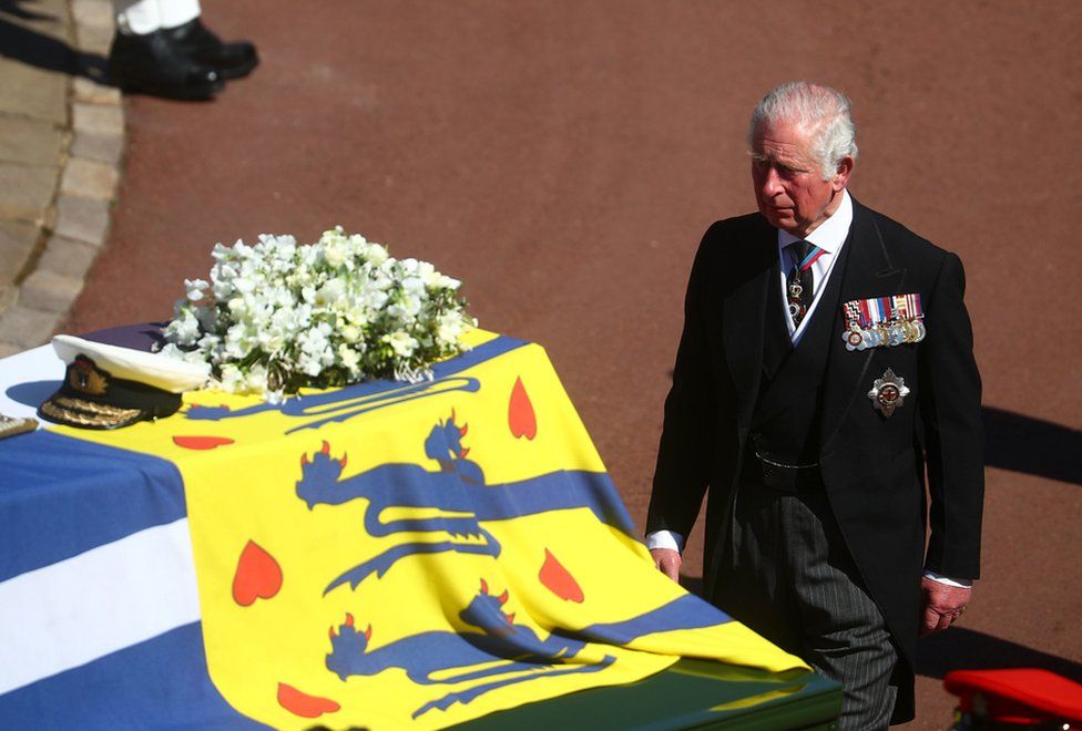 The coffin was draped with the duke's personal standard, with flowers chosen by the Queen and the duke's Admiral of the Fleet Naval Cap and sword, pointing forwards.