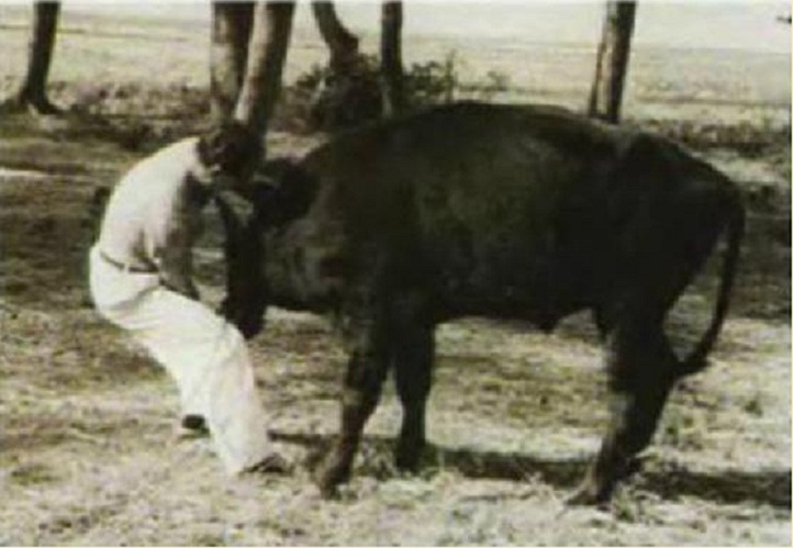 황소를 길들이는 왕년의 최배달. 그는 1950년 11월 일본 다테산(館山)에서 맨손으로 수십 마리의 소와 결투를 벌여 총 47마리를 무찌르고 4마리를 즉사시켰다. 사진=조선DB