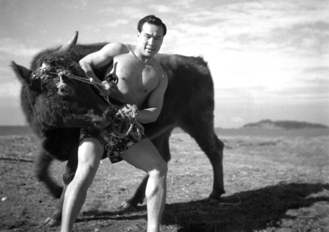 황소를 길들이는 왕년의 최배달. 그는 1950년 11월 일본 다테산(館山)에서 맨손으로 수십 마리의 소와 결투를 벌여 총 47마리를 무찌르고 4마리를 즉사시켰다. 사진=조선DB