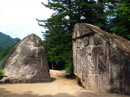 백화암터를 나와 전나무 숲길을 또 걸으면 큰 문이 버티고 선 듯한 바위를 만난다. 오른쪽의 큰 바위는 나옹선사가 새겼다는 삼존불이 모셔져있고, 왼쪽 바위에는 60개의 화불과 보살 두분이 새겨져 있다. 이 두 바위에는 나옹선사와 김동이라는 거사의 이야기가 전해져 온다.
