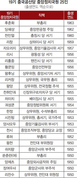 반면 1955년생 트리오인 리커창(李克强) 국무원 총리, 왕양(汪洋) 전국정협 주석, 왕후닝(王滬寧) 중앙서기처 서기(중앙정책연구실 주임)를 비롯해 1957년생인 자오러지(趙樂際) 중앙기율검사위 서기는 그나마 정치국 상무위에 유임될 여지가 한 가닥 남아 있다.