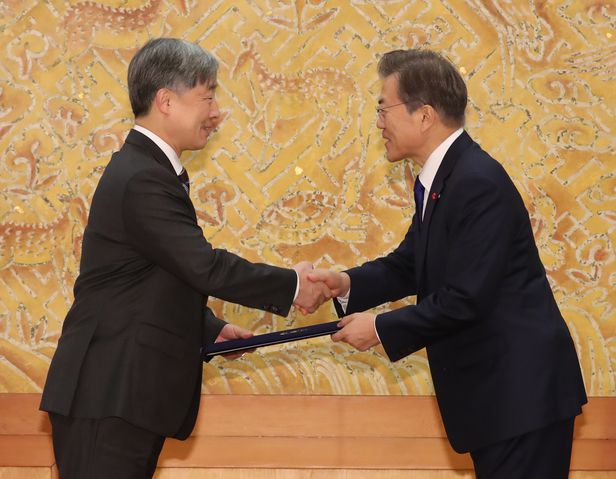 2018년 1월 2일 문재인 대통령이 청와대에서 최재형 감사원장에게 임명장을 수여하고 있다./연합뉴스