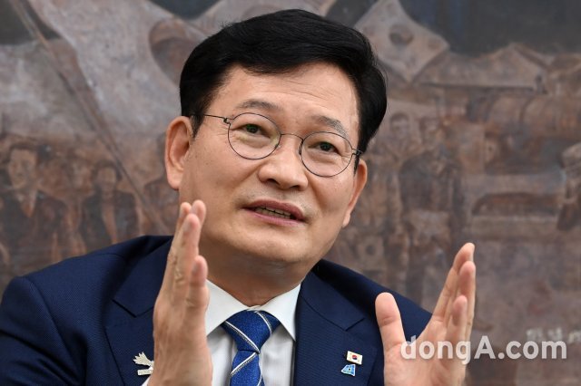 더불어민주당 송영길 대표가 29일 서울 여의도 국회에서 경제신문들과 인터뷰를 하고 있다. 사진공동취재단