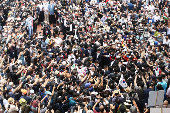 윤석열 전 검찰총장이 29일 서울 서초구 매헌 윤봉길 의사 기념관에서 기자회견을 마친 뒤 지자자들의 환호를 받으며 이동하고 있다. 〈사진=국회사진기자단〉