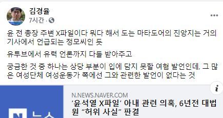 김 회계사는 이날 페이스북에 “궁금한 것 중 하나는 (윤석열 X파일)상당 부분이 입에 담지 못할 여혐 발언인데, 그 많은 여성단체 여성운동가 쪽에선 그와 관련한 발언이 없다는 것”이라고 꼬집었다.
