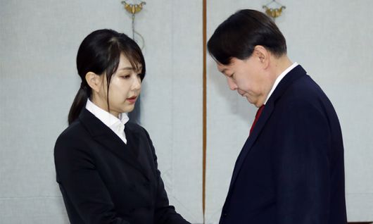 지난 2019년 7월 25일 윤석열 당시 신임 검찰총장이 청와대에서 문재인 대통령으로부터 임명장을 받기 위해 입장해 부인 김건희 씨의 내조를 받고 있다. 연합뉴스