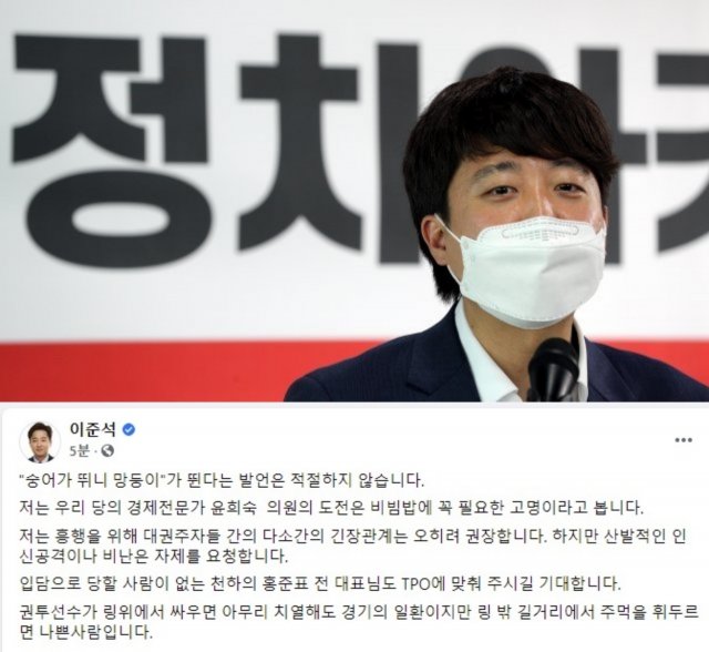 이준석, ‘윤희숙 망둥이’ 발언 홍준표에 “링 밖서 주먹쓰지 마라”