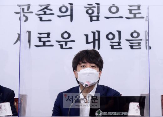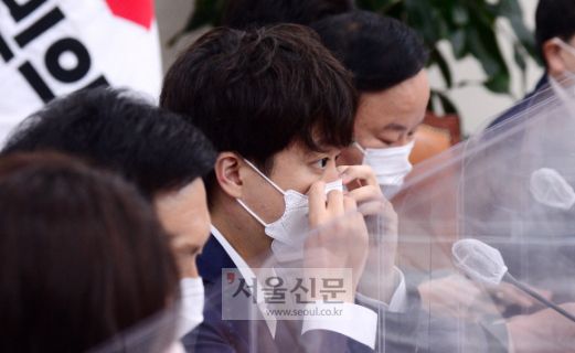 국민의힘 이준석 대표가 5일 서울 여의도 국회에서 열린 최고위원회의에서 마스크를 고쳐쓰고 있다.2021. 7. 5 김명국 선임기자 daunso@seoul.co.kr