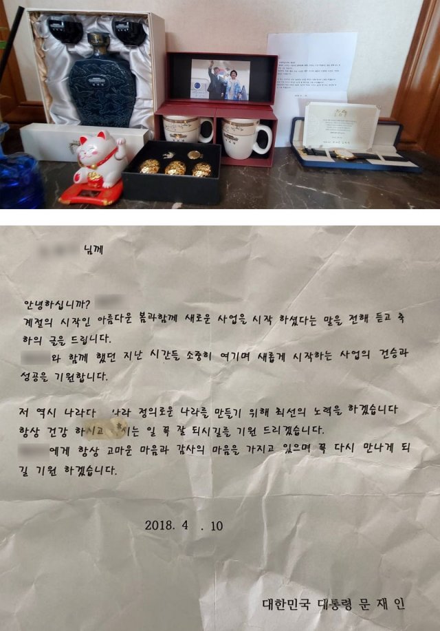 김 씨는 문재인 대통령 부부 사진과 청와대 문양이 새겨진 기념품을 집에 전시해 놓고 문 대통령으로부터 직접 편지도 받았다고 주장했다. 전직 직원은 “김 씨가 ‘대통령 선거 때 대선 캠프에 있었고, 자기가 선거운동도 했다’고 말했다”면서 “대통령이 김 씨가 포항에서 사업을 한다고 하니 편지도 써줬다고 자랑했다”고 말했다. 대통령 명의의 휴먼편지체로 인쇄된 A4용지 1쪽 분량의 편지에는 김 씨의 실명을 네 번이나 언급하면서 ‘사업의 성공을 기원한다’ ‘항상 고마운 마음을 가지고 있다’는 내용이 적혀 있다. 하지만 편지가 청와대의 공식 서식과 차이가 있어 김 씨가 주변인에게 대통령과의 친분을 과시하기 위해 조작한 것으로 보인다. 이에 대해 청와대 관계자는 “김 씨에게 어떤 서신이나 선물을 보낸 적이 없다”면서 “대통령이 보낸 편지가 저렇게 허술할 리가 없다. 어이가 없다”고 말했다.
