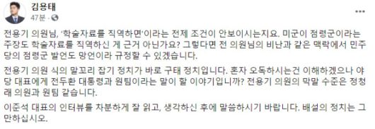 김 최고위원은 이날 자신의 페이스북에서 전용기 의원을 향해 "'학술자료를 직역하면'이라는 전제 조건이 안 보이나"라며 "미군이 점령군이라는 주장도 학술자료를 직역한 게 근거 아닌가. 그렇다면 전 의원의 비난과 같은 맥락에서 민주당의 점령군 발언도 망언이라고 규정할 수 있다"고 말했다.