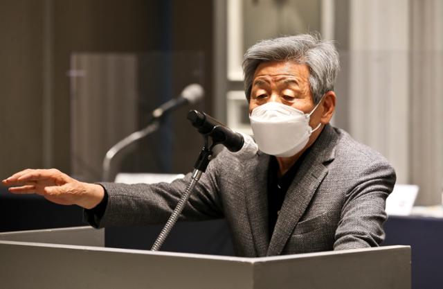 5월 10일 유인태 국회 국민통합위원회 정치분과위원장이 서울 켄싱턴호텔 여의도에서 열린 '대전환의 시대, 새로운 정치의 모색' 정치개혁 토론회에서 축사를 하고 있다. 연합뉴스