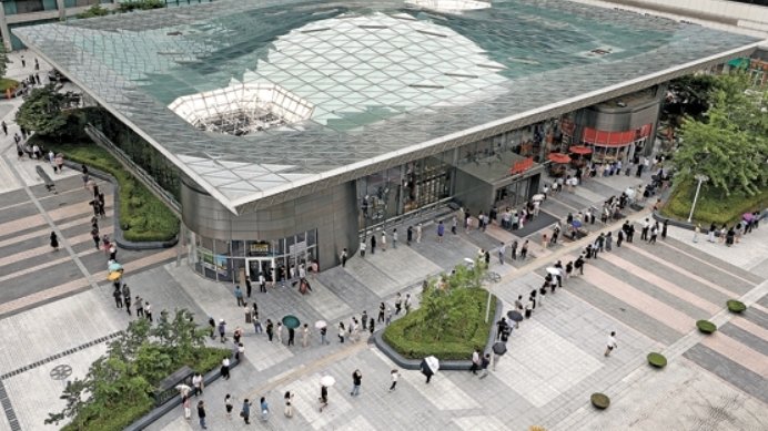 7일 서울 강남구 삼성역에 있는 임시 선별진료소(왼쪽 위 원 안)에서 시민들이 검사를 받기 위해 줄을 서 있다. 대기줄은 진료소 인근 쇼핑몰까지 700m 가량 이어졌다. 진료소 인근 현대백화점 무역센터점에서는 이날까지 69명의 집단감염이 발생했다. 중대본은 6월 26일~7월 6일 백화점 방문자는 검사를 받으라고 공지했다. 김성룡 기자, [뉴시스]