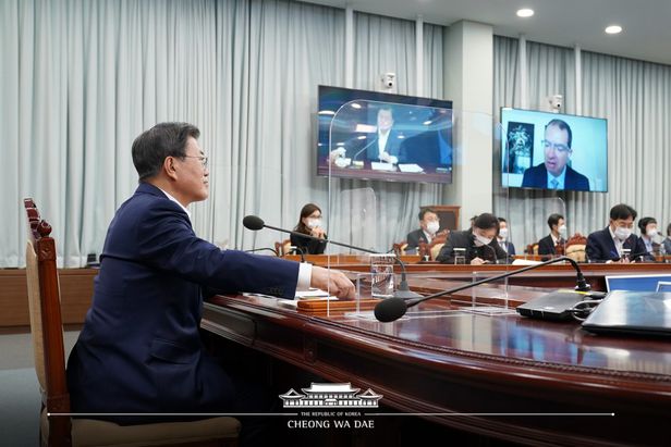 청와대가 작년 12월 문재인 대통령의 모더나 백신 2000만명분 직접 확보 소식과 함께 공개했던 대통령 화상통화 장면. /청와대