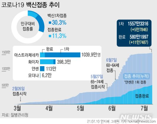 누적 1차 접종자는 1557만3316명이다. 지난 2월26일부터 134일 동안 전체 인구(5134만9116명·2020년 12월 주민등록 거주자 인구)의 약 30.3%가 1차 접종을 받았다.