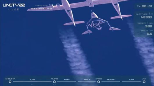 이륙 약 40분 뒤 유니티는 고도 13km 지점에서 거대 화염을 뿜어내며 로켓 엔진을 점화했다. 이후 모선에서 분리된 유니티는 빠른 속도로 우주를 향해 날아오르며 지구 가장자리인 상공 88km에 이르렀다. 영국 파이낸셜타임스는 비행선의 속도가 음파 속도의 3배에 달했다고 전했다.