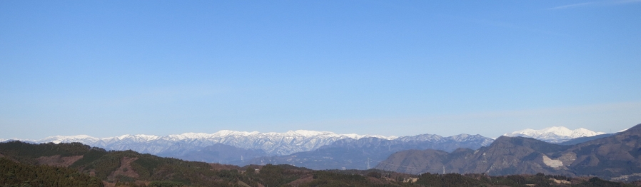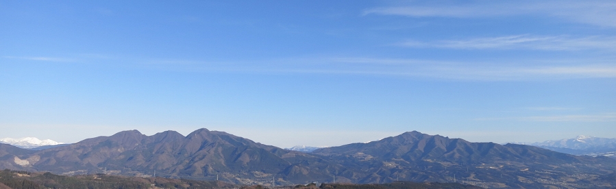 谷川岳の右は小野子山、左から十二ケ岳・中岳・小野子山と三つの峰が、隣は子持山