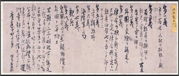 一策 天下ノ政権ヲ朝廷ニ奉還セシメ、政令宜シク朝廷ヨリ出ヅベキ事二策 上下議政局ヲ設ケ、議員ヲ置キテ万機ヲ参賛セシメ、万機宜シク公議ニ決スベキ事三策 有材ノ公卿諸侯及天下ノ人材ヲ顧問ニ備ヘ、官爵ヲ賜ヒ、宜シク従来有名無実ノ、官ヲ除クベキ事四策 外国ノ交際広ク公議ヲ採リ、新ニ至当ノ規約ヲ立ツベキ事五策 古来ノ律令ヲ折衷シ、新ニ無窮ノ大典ヲ撰定スベキ事六策 海軍宜シク拡張スベキ事七策 御親兵ヲ置キ、帝都ヲ守護セシムベキ事八策 金銀物貨宜シク外国ト平均ノ法ヲ設クベキ事