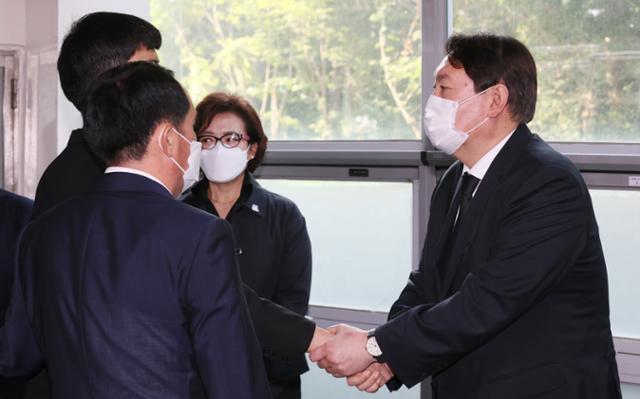 ‘천안함 46용사’ 가운데 한 명인 고(故) 정종율 해군 상사의 부인 정모씨가 21일 암 투병을 하다 별세했다. 윤석열(오른쪽) 전 검찰총장이 22일 오후 인천시 동구 청기와장례식장에서 유가족과 인사를 하고 있다. 뉴스1