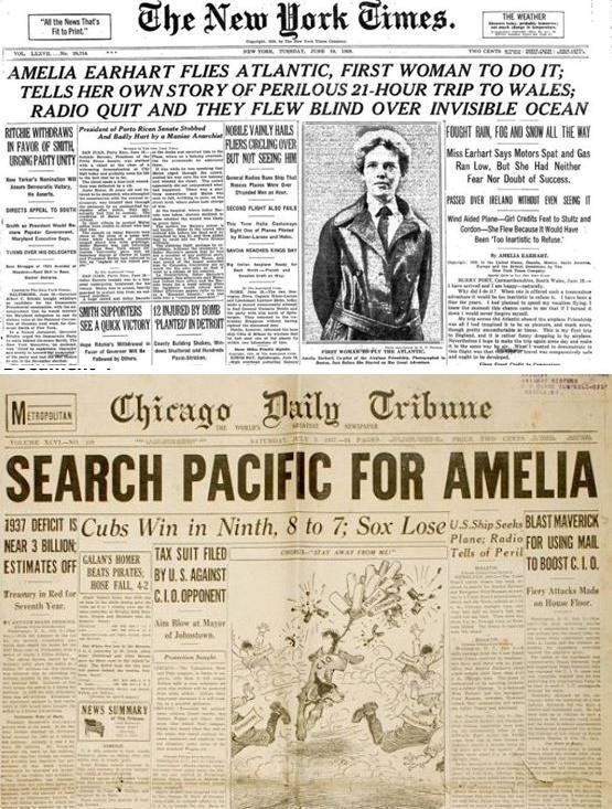 아멜리아 에어하트가 실종된 직후 관련 기사가 미국 일간 뉴욕타임스(위)와 시카고데일리트리뷴 1면에 실렸다. 각사 홈페이지 캡처