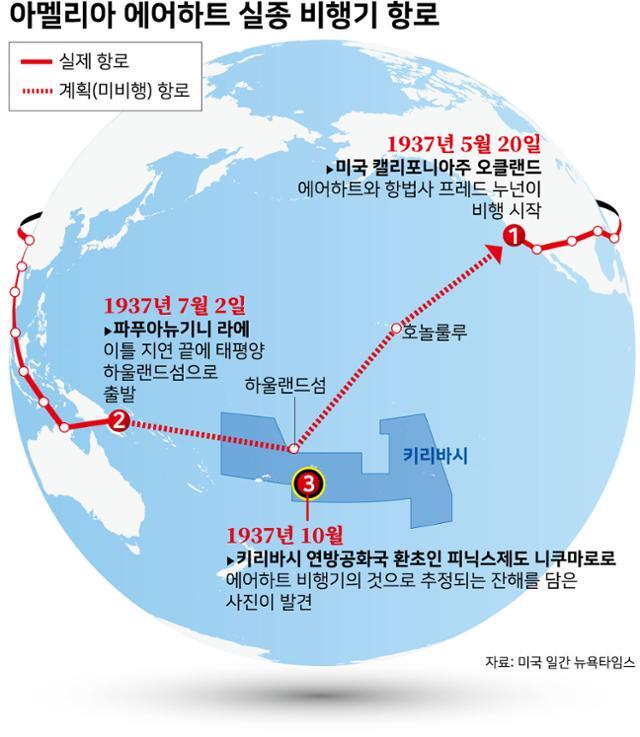 아멜리아 에어하트 실종 비행기 항로. 그래픽=강준구 기자