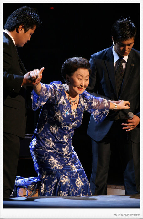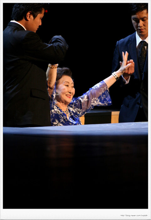 공연이 끝난 후 포토세션이 이었는데 객석에 있던 금사향 선생이 경호원의 등에 업혀 무대위로 올라왔다.