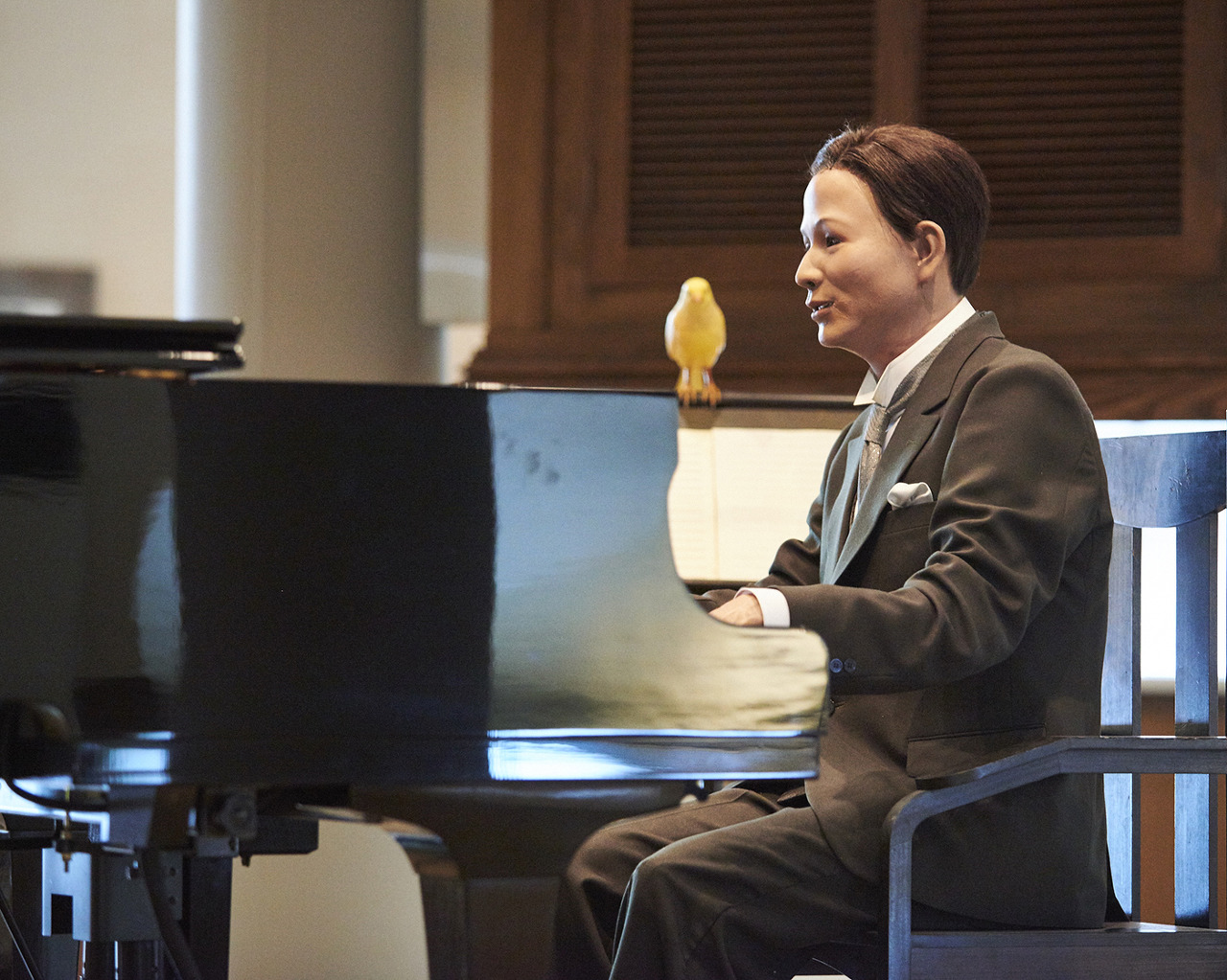 まずは北秋田市米内沢(よないざわ)にある「浜辺の歌音楽館」へ。開館は昭和63年。大正ロマンを意識した六角形の建物で、1階はたくさんの作品が試聴できるリスニングルームが3つ、2階がおもな展示ブースとなっている。さまざまな資料が並ぶ室内の真ん中には、精巧な為三さんロボットが!