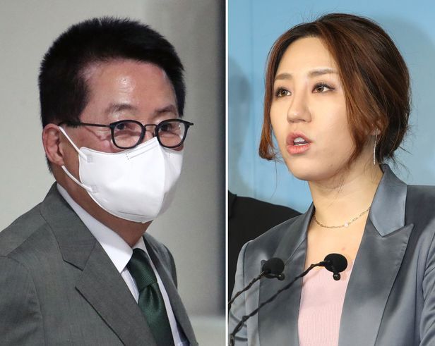 박지원(왼쪽) 국정원장과 조성은 전 미래통합당 중앙선대위 부위원장.