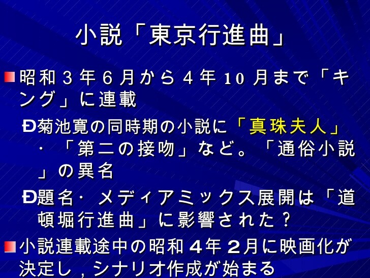『東京行進曲』と聞いて、原作の菊池寛の小説や、1929(昭和4)年公開の無声映画を思い出す人は少なかろう。興行的にはヒットしなかった映画を差し置いて、佐藤千夜子が歌った同名の主題歌の方が、今や世に知られている。
